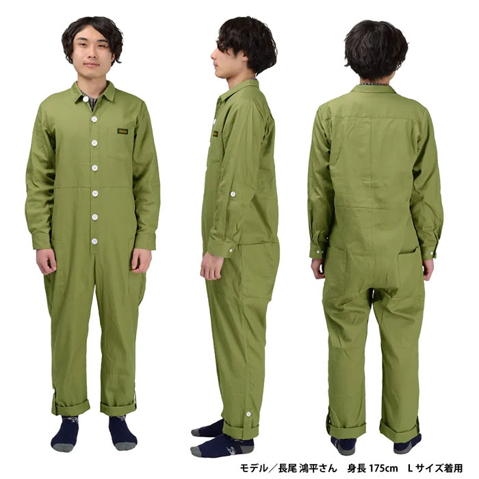 フロントボタンデザインを採用したオーバーオール。